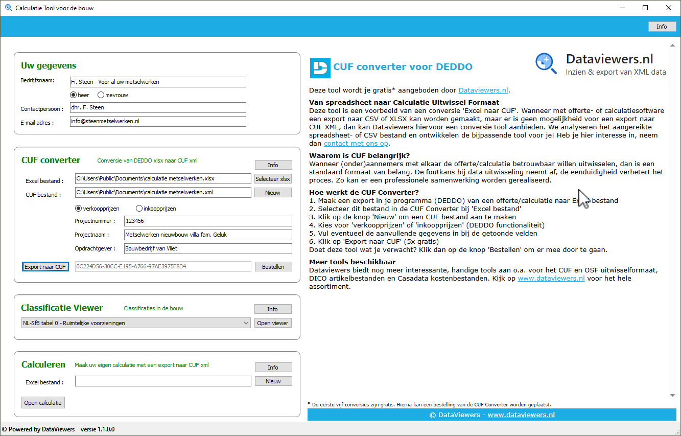 Deze tool is een voorbeeld van een conversie ‘Excel naar CUF’. Wanneer met offerte- of calculatiesoftware een export naar CSV of XLSX kan worden gemaakt, maar er is geen mogelijkheid voor een export naar CUF XML, dan kan Dataviewers hiervoor een conversie tool aanbieden. We analyseren het aangereikte spreadsheet- of CSV bestand en ontwikkelen de bijpassende tool voor je! Heb je hier interesse in, neem dan contact met ons op.